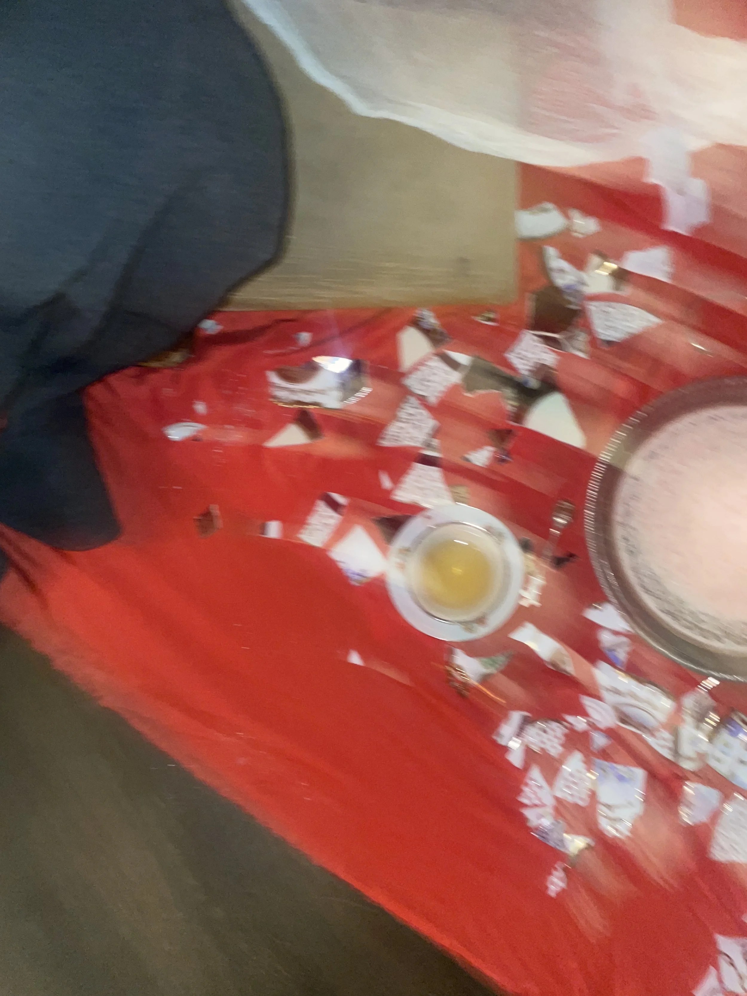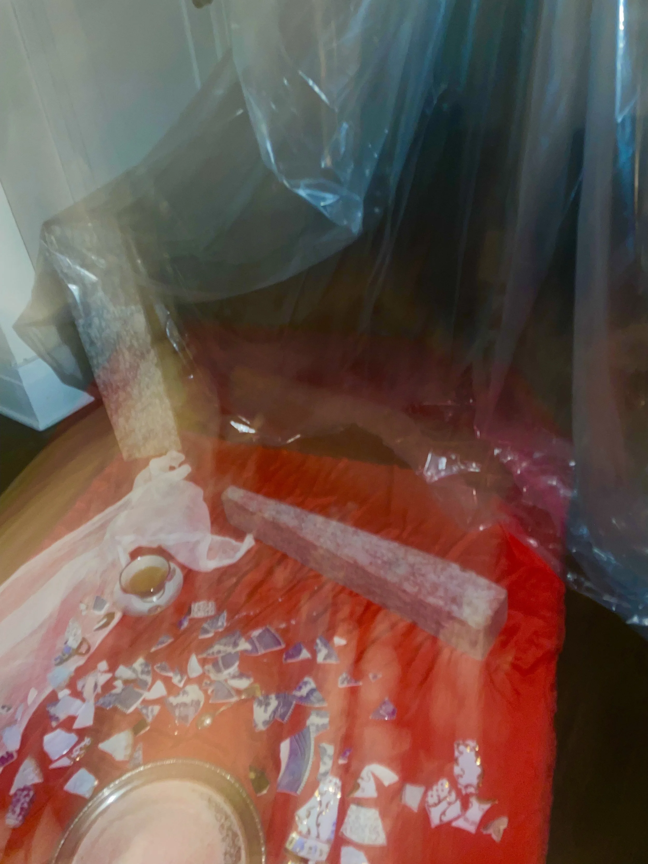 Set atop Delicate red silk, the installation becomes a contained world. The fractured frame of an antique wooden chair lies in piles of broken legs and torn upholstery. A vintage wool coat draped across the remains lingers like a ghost of the self. Scattered throughout are fragments of once-whole objects: shattered teacups and saucers, a broken antique silver cuff, a vintage pearl and silver ring gifted by a deceased grandmother, an antique porcelain snuff bottle, a silver carafe, and a small silver cup tipped onto its side.